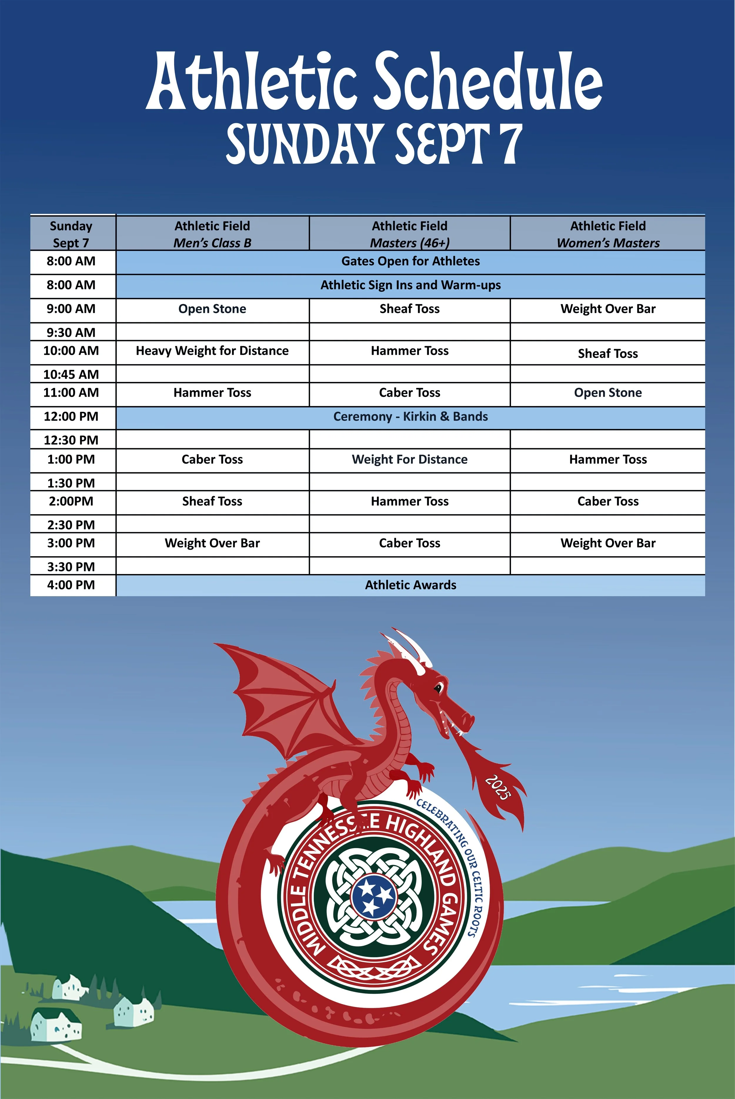 The Middle Tennessee Highland Games provides the chance for amateur athletes to compete in all the traditional Heavy Scottish Athletic events, to the thrill of a large crowd of fans. Men over 40 compete in the Masters Class and men under 40 compete in the Men’s class. We also have a Women’s Amateur class and a Women’s Masters class.